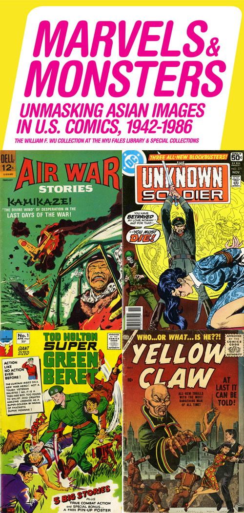 Through a selection of images from comic books representing four turbulent decades, Marvels & Monsters illustrates how evolving racial and cultural archetypes defined America’s perceptions of Asians. This exhibition draws from noted science fiction author and cultural studies scholar William F. Wu’s comic book collection—the largest archive of comic books featuring Asians and Asian Americans—that was donated to the NYU Fales Library & Special Collections through the Asian/Pacific/American Institute at NYU.